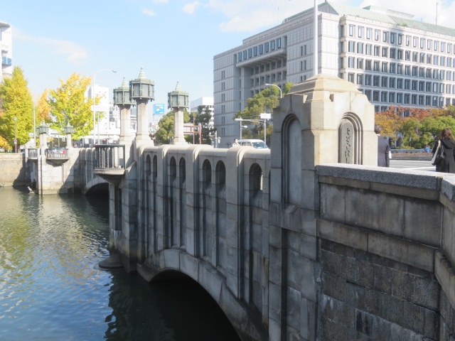 地下鉄の淀屋橋駅から大阪駅に向かう時渡りました、ビジネス街・金融街にある土佐堀川に架かる御堂筋(国道25号線)の橋で国の重要文化財に指定されています、昭和10年(1935年)完成、鉄筋コンクリート造りの3径間のアーチ橋、橋長53.5m、幅員36.5mあります、車、人の通行が多いです。