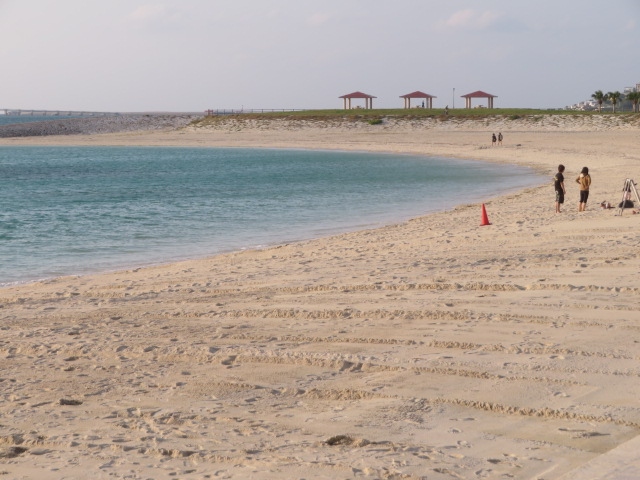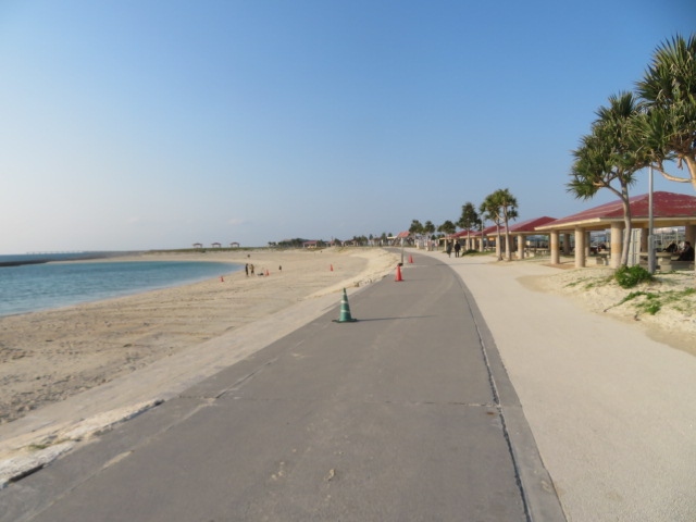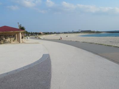 那覇空港から最も近いビーチで豊見城市の豊崎海浜公園にあります、今回宿泊したグランビューガーデン沖縄から歩いて行きました、大型ショッピングモールのイーアス沖縄豊崎そばにあります、800台の駐車場があります、全長700mの沖縄県でも最大級の人工ビーチです、シャワー・トイレ・ロッカーがある管理棟、売店、屋上展望台などあります、バーベキューエリア、ビーチサッカー・ビーチバレーのエリアもあります、レンタサイクルもありいろいろ楽しめます、空港が近いので頭上を飛行機が飛んでいました。