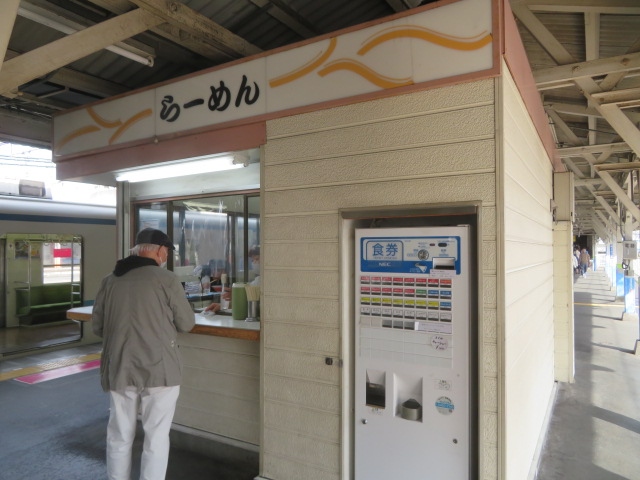 東武アーバンパークライン(東武野田線)春日部駅7番・8番線のホームにある立食いの春日部ラーメンです、立ち食いというとそばが殆どですがここは珍しいラーメンの立食いです、かなり前からあります、テレビなどで何回も紹介されている人気店です、券売機(現金のみ)で食券を買い、カウンターに渡すと番号札が貰え、できると番号で呼ばれます、待たされることもあります、ラーメン(500円)は昔ながらのラーメン、美味しかったです、コロッケラーメン(610円)、天ぷらラーメン(620円)が特に人気のようです、駅の入場券を買ってくる人もいるようです、東武ラーメンは他に西新井駅ホームにもあります。