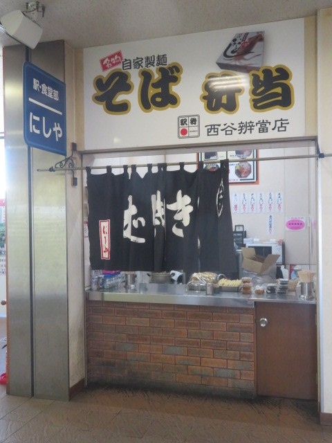日高本線静内駅の中にある駅弁と立ち食いそばの西谷弁当店です、駅弁は海鮮うに蟹イクラ(1080円)、焼ホタテ蟹飯(780円)など数種類ありますが、予約制です、予約していなかったので買うことはできませんでした、立ち食いそばは駅の待合室で食べることが出来ます、かけそば(380円)で我慢しました、創業60年以上ののようですが日高本線廃止以降はどうなるか気になります。