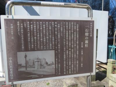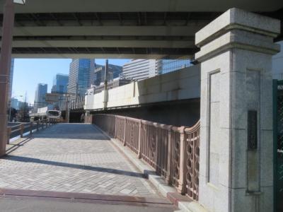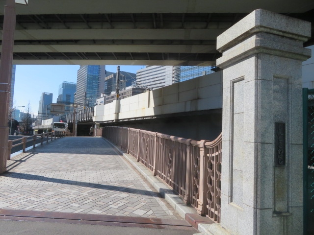 八重洲1丁目の親柱が残っています、江戸城の外濠が日本橋川と分岐する地点に江戸初期からあった橋で、大正11年6月に木橋からRCアーチ橋に改架され、橋長43m、幅27mで花崗岩の石造りの橋となりました、親柱は4本ありましたが現在残っているのはここにある1本です、隣にある常盤橋など日本橋川に架かる橋を見ると歴史を感じることが出来ました。