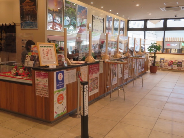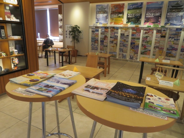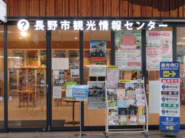 JR長野駅の東西自由通路みどりの窓口前にあります、広くて綺麗なフロアに近隣市町村の観光パンフレットが多く置いてあります、フロア内には椅子・テーブルもあります、スタッフが常駐しているので聞くことができます、ここで市街の地図をもらって善光寺まで行きました、朝は九時から開いています。