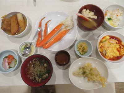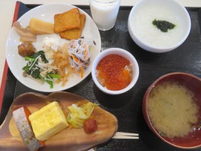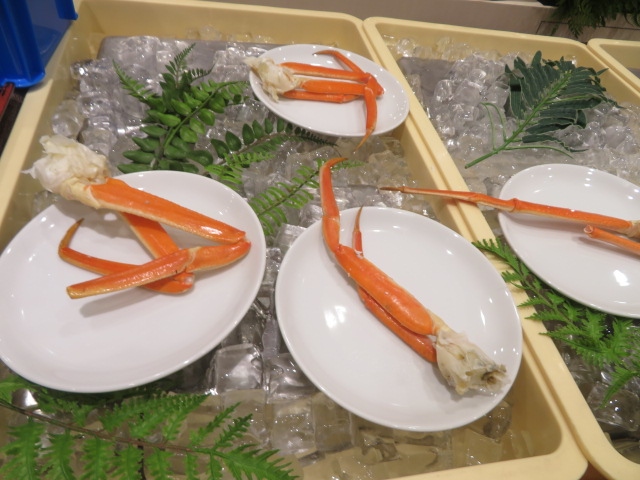 食事は夕食・朝食ともレストランでバイキングでした、夕食時には美味しくないですがカニが出て自由に食べることが出来ました、料理はそこそこの種類がでました、デザートはフルーツ・アイスクリームがありました、朝食にはいくらがありました、牛乳は函館牛乳が出ていました。