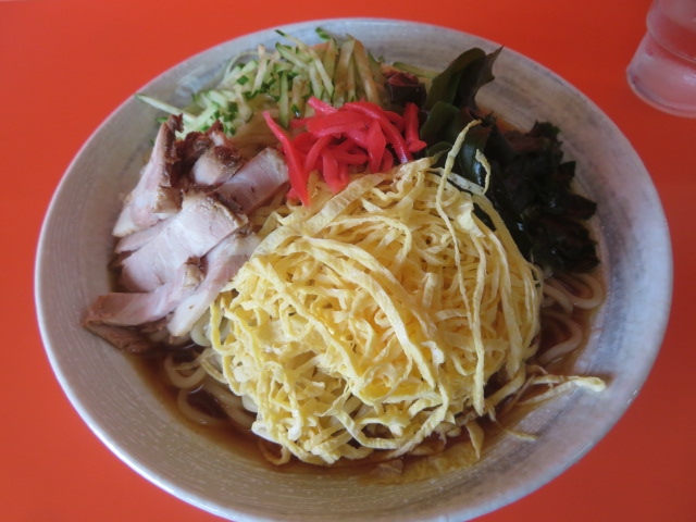 東京スカイツリーライン新田駅東口から駅前商店街を2分程歩くと左側にあるラーメン屋さん、昔ながらのラーメン屋という感じ、店を入ると券売機があります、カウンターとテーブル席があります、一人で入る人が多いようです、ラーメン類と餃子が主です、今回は冷し中華(700円)を食べました、大盛も同じなので大盛りを食べました、麺は太麺でした、普通に食べることが出来ました。