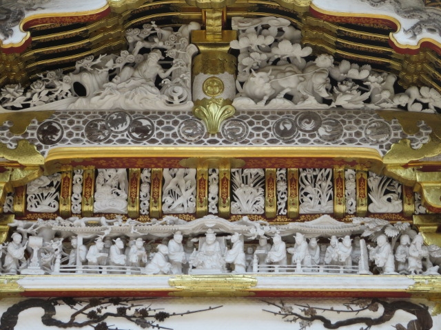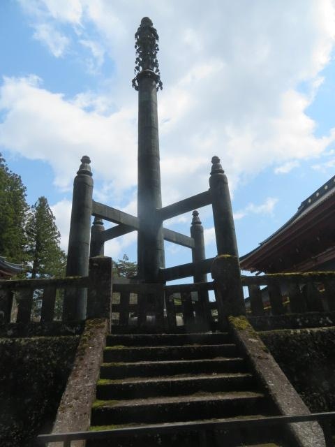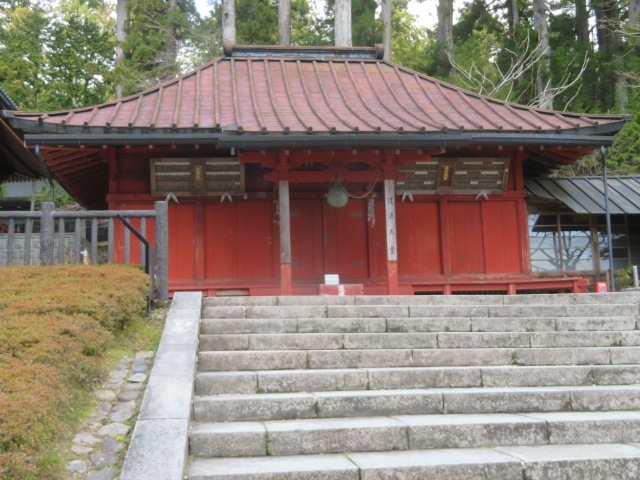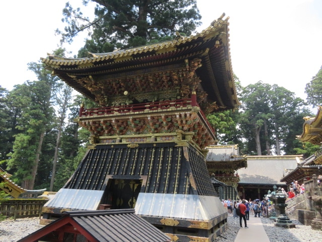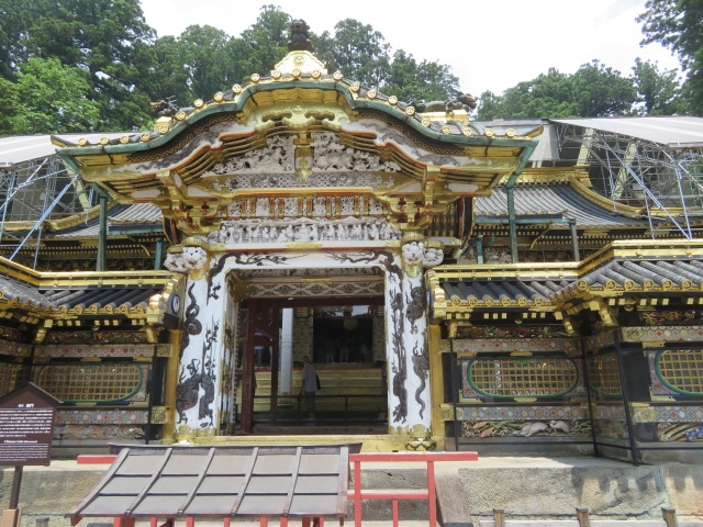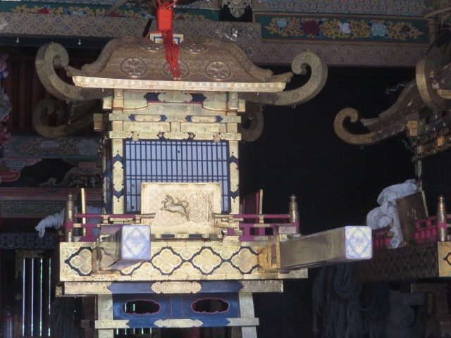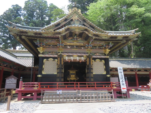 東照宮の陽明門をくぐって左に行くと入母屋造の神輿舎(しんよしゃ)があります、創建は1636年(元和3年)で重要文化財に指定されています、中には入れませんが外から3基の神輿を見ることができます、中央に三葉葵の紋が入った主祭神の家康公のもの、左右に源頼朝公、豊臣秀吉公のものがあります、春と夏に行われる千人武者行列で披露されます、重さは約800㎏で、以前は1000㎏あったようです、天井には天女奏楽の図が描かれています、ちょっと中が暗いので見づらかったです。