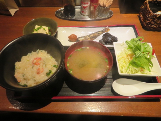 山陰本線安来駅から近い国道9号線そばにある居酒屋ですが昼はランチセットがあるお店です、カウンターがあるので一人でも気軽に入れました、店の前には駐車場があります、行った日が七草粥を食べる日だったので、その日だけの定食にありました、七草粥とみそ汁、サラダ、豆腐、小魚なついて670円で食べることができお得でした、偶然その日だけの食事が出来ました。