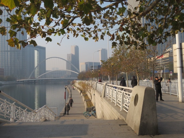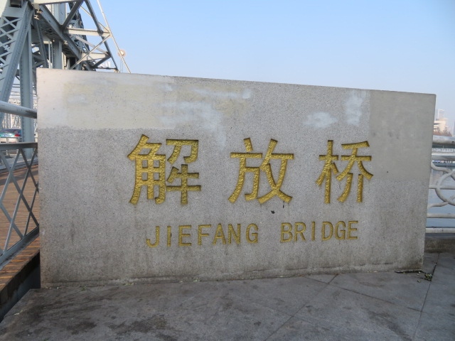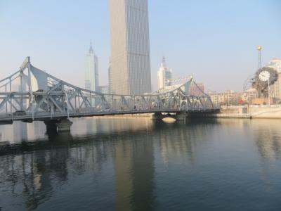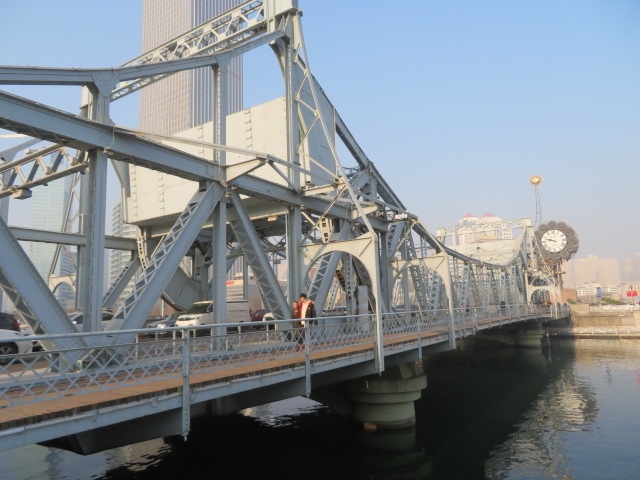 天津駅と津湾広場・解放北路の間にある天津市街中心を流れる海河に架かる鉄橋です、地下鉄3号線の津湾広場站からすぐ行けます、周辺に散策路や広場があるので多くの観光客が来ていました、鉄板で出来た歩道を海河や周辺の風景を見ながら歩きました、写真を撮る人も多くいました、かつては船が航行する時中央部が開く跳開橋だったようです。