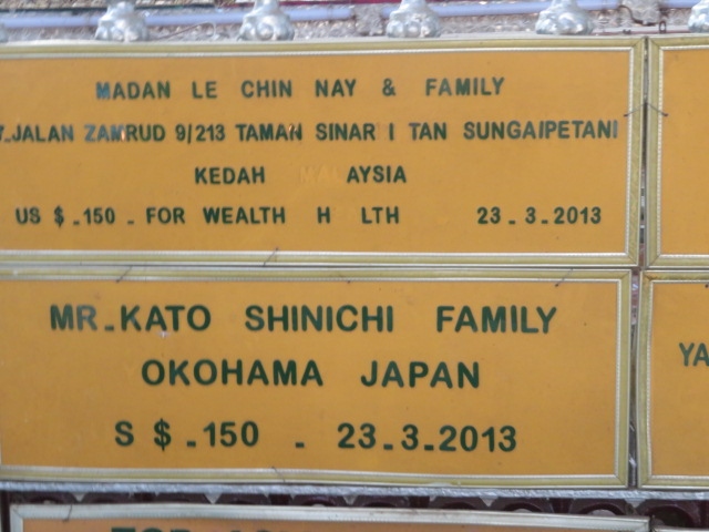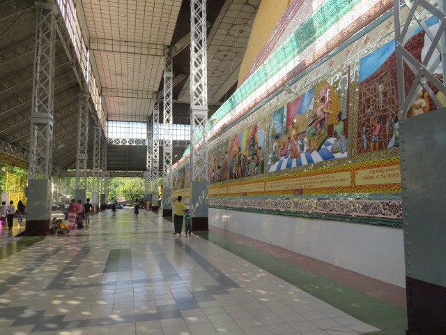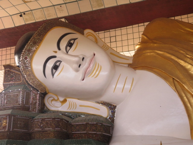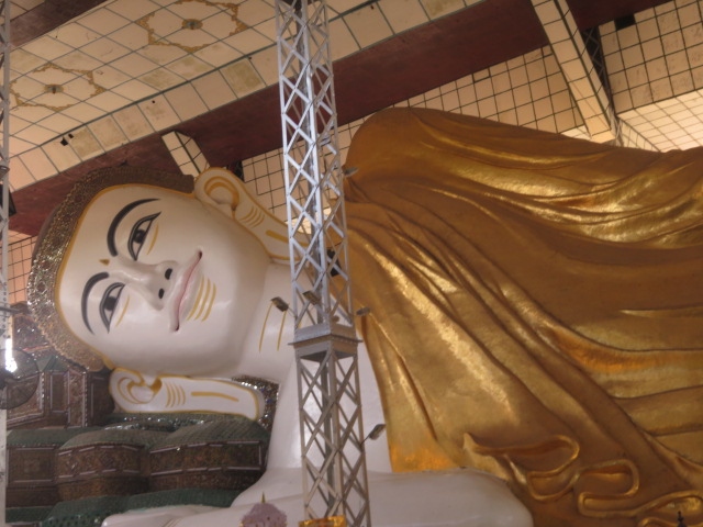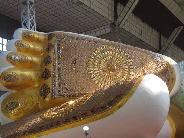 古都バゴーにあるミャンマー最古の寝仏で994年モン族の王によって建立されたと言われています、映画ビルマの竪琴の舞台としても知られています、寝仏のサイズは全長55m高さ16m口の左右2.3m足の裏7.7mあります、顔は優しそうです、足の裏の模様も綺麗です、寝仏をゆっくり歩いて周りにある仏画を見ながら一周しました、寄付をした日本人の名前が表示されていました。