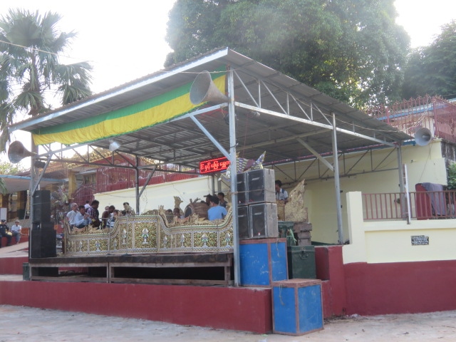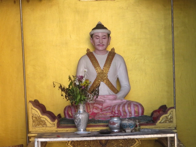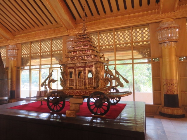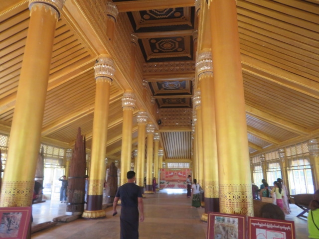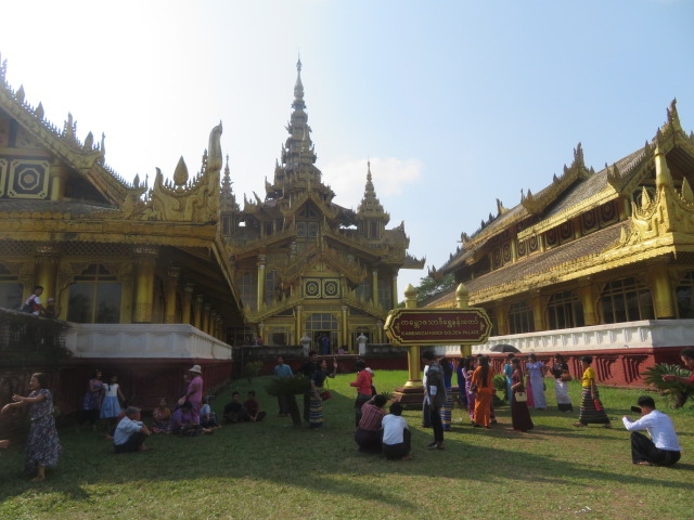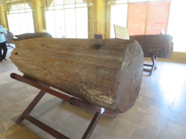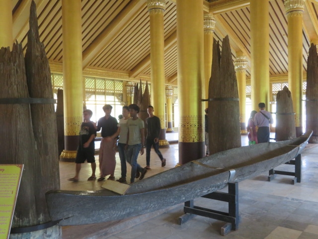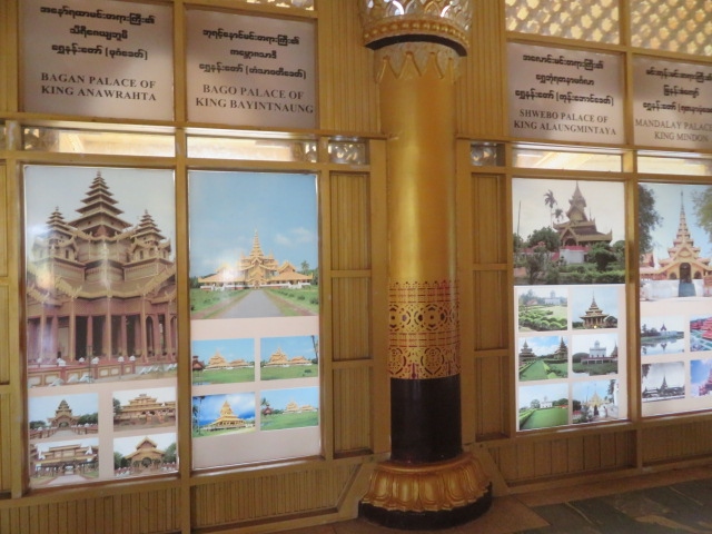 古都バゴー市街の王宮発掘現場で再建されたモン族の城塞・王宮と出土した建材、王座や調度品、壺などが展示されている博物館を見学しました、王宮は火災で消滅しましたが再建されて黄金の部分が多い豪華な博物館に、写真の展示が多くありました、ここは寺院ではないので靴のまま歩くことが出来ました。