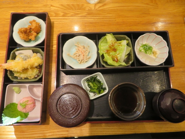 居酒屋チェーンの天狗の和食れすとらんの蕨店を利用しました、蕨駅から10分程歩いて川口市の芝2丁目にあります、建物の下が駐車場で2階がお店になっています、昼時なので安いランチ(658円)がありましたが好みでないので旬菜御膳(988円)を食べました、天ぷらは揚げたてなので美味しかったです。