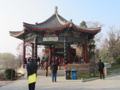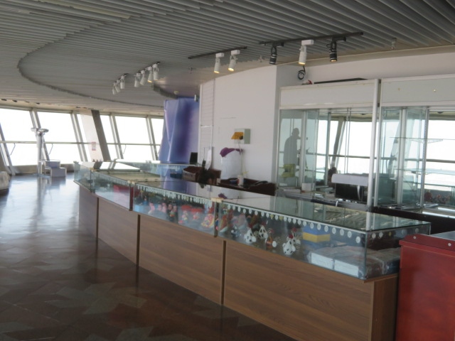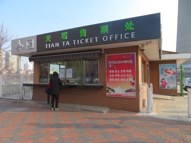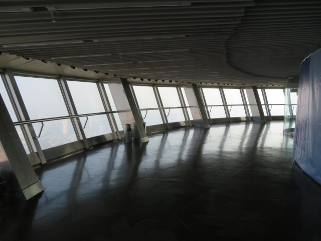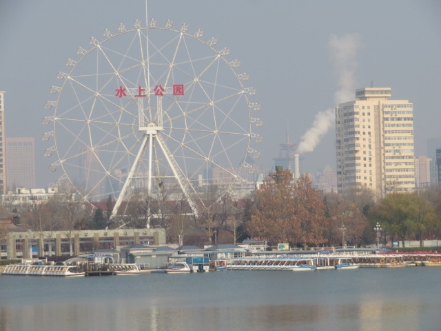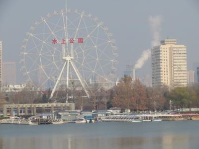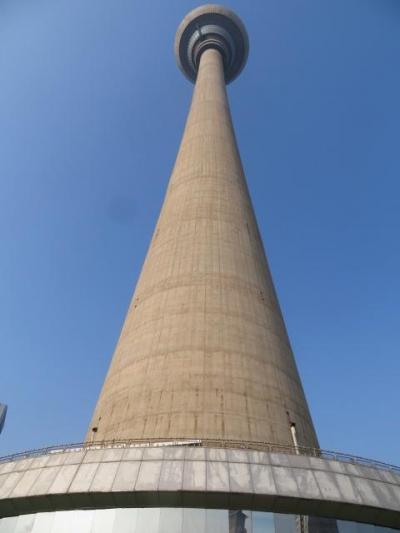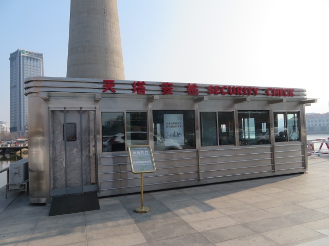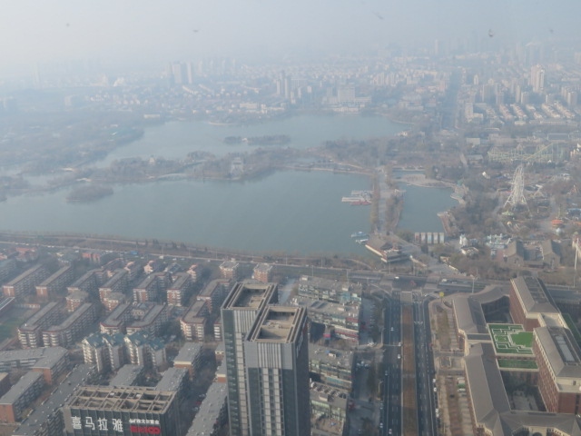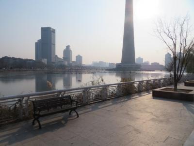 天津市街の天塔湖にある高さ415.2mの電波塔です、地下鉄3号線の天塔站より湖沿いの遊歩道を歩いて10分位で着きました、入場料45元を払って敷地内に入りインホメーションで日本語パンフレットをもらい入口に、ペットボトルを預けてセキュリティチェックを受けて遊歩道を歩いて天塔湖の中央にある天塔入口に、スタッフの案内でエレベーターに乗り高さ253mの展望台に、誰もいなくて静かでした、ショップと自販機がありました、眺めが良く、市街の高層ビル群や水上公園など見て楽しみました、今は人気が無いようでした。