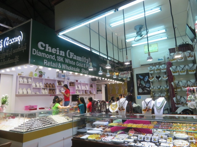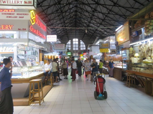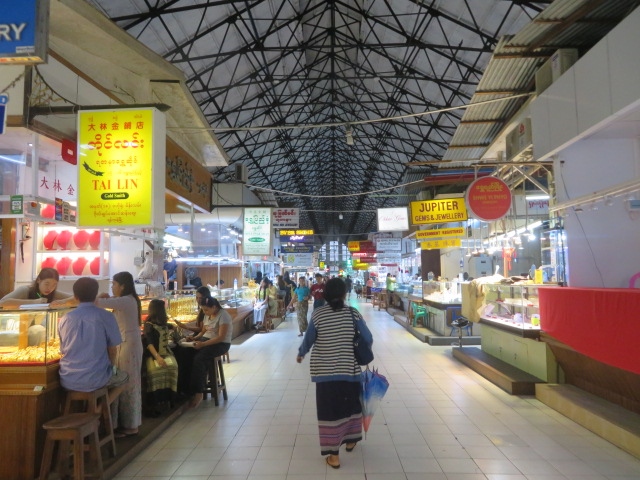 ヤンゴン市街にある大きくていつも賑やかなマーケットで、いつも多くの観光客がいます、歩いていると日本語で声を掛けてきます、声掛けは無視してスリに気をつけなが歩きました、宝石貴金属類や衣料雑貨中心にいろいろな物があります、観光客向けのお土産になる民芸品類も多くありました、買うときは値段交渉が必要のようです、隣接して大きなジャンクションシティがあるので一緒に回りました、ここのトイレは有料でした。