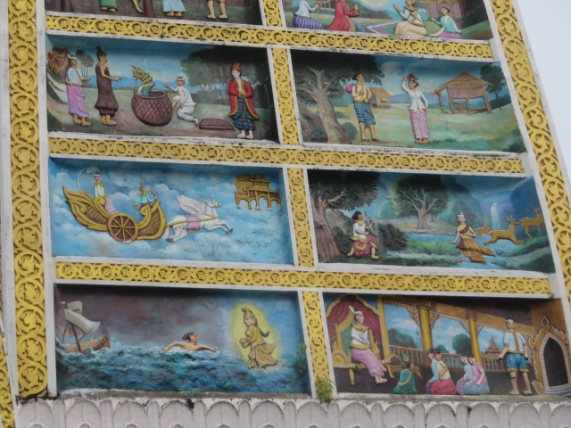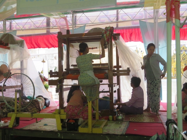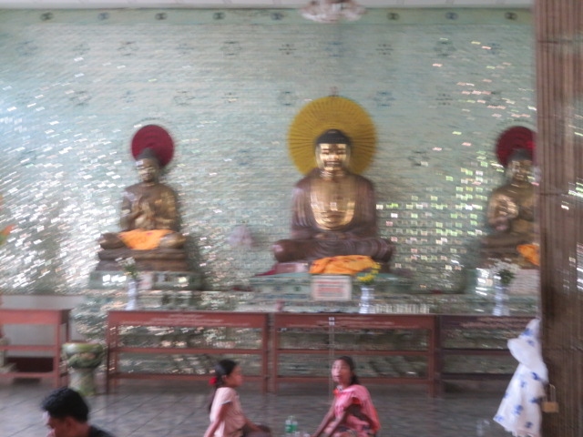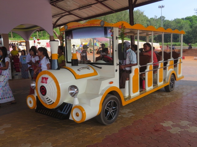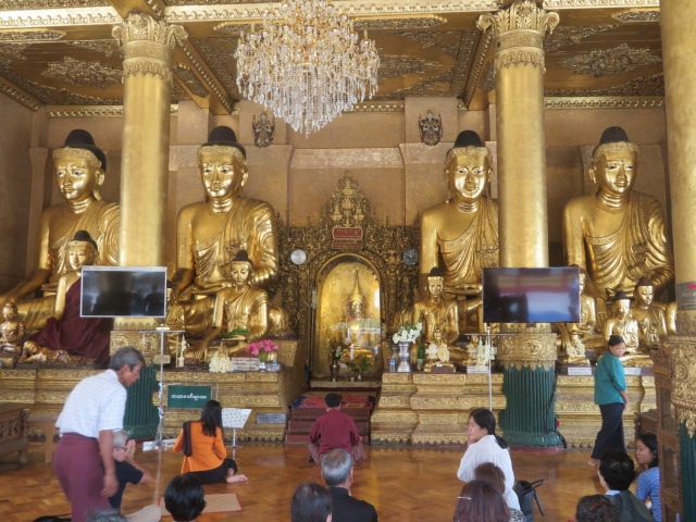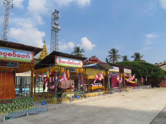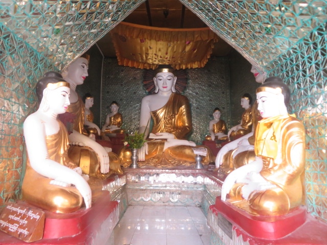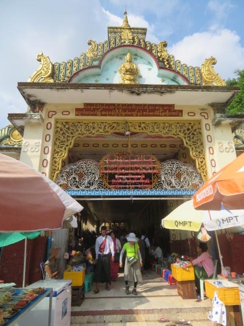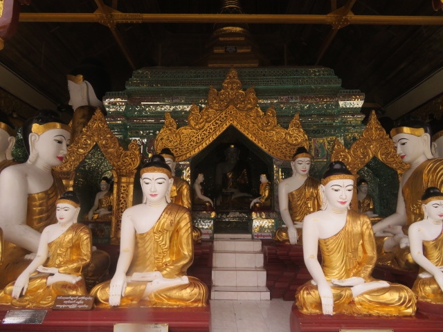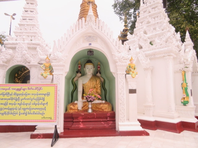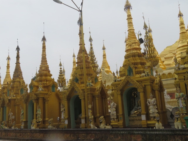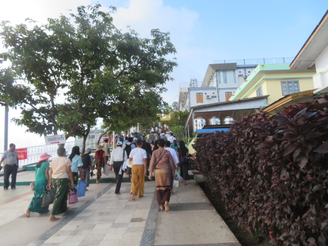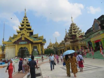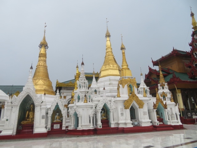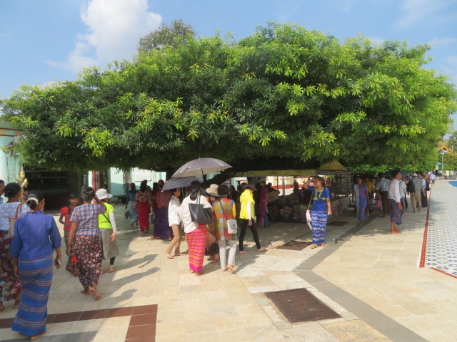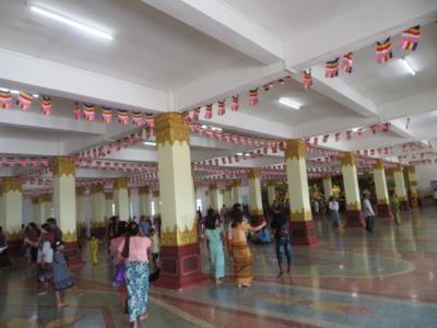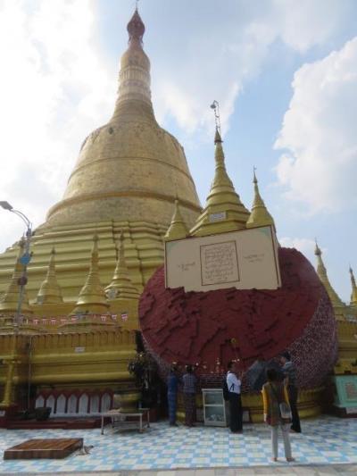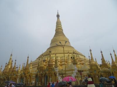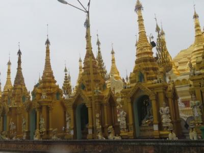 小雨が降る中ガイドの話を聞きながら広い境内を裸足で歩きました、約2500年前に建てられたようでミャンマー最大の聖地としていつも参拝者で賑わっています、境内の中心に高さ約100m仏塔があり最頂部には76カラットのダイヤモンドが埋め込まれています、今年の5月には金箔が張り替えられたようでとても綺麗でした、多数の仏塔、仏像に仏画を見ながら歩きました、参拝料はミャンマー人は無料ですが外国人は10000チャット必要です。