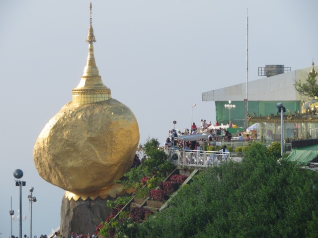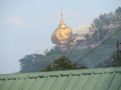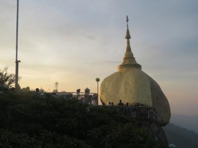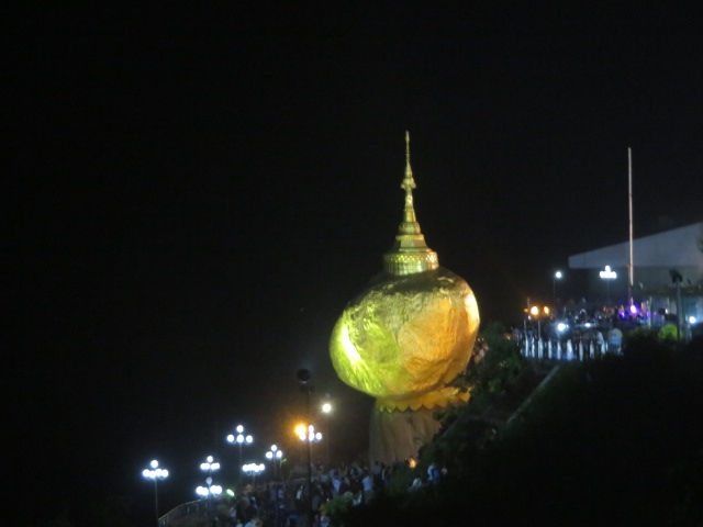 麓にあるキンプンからトラックの荷台に乗ってゴールデンロック参道入口に到着、ここから参道を歩くとゴールデンロックに、私達は参道沿いにあるチャイトーホテルに宿泊したので空身で参拝しました、宿がそばなので夜も参拝しました、ライトアップがされていて綺麗でした、早朝には朝日鑑賞をしながら朝日が当たる姿を見ました。