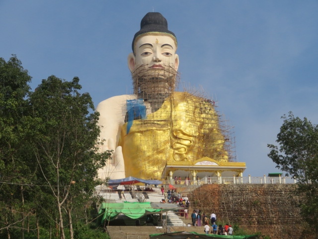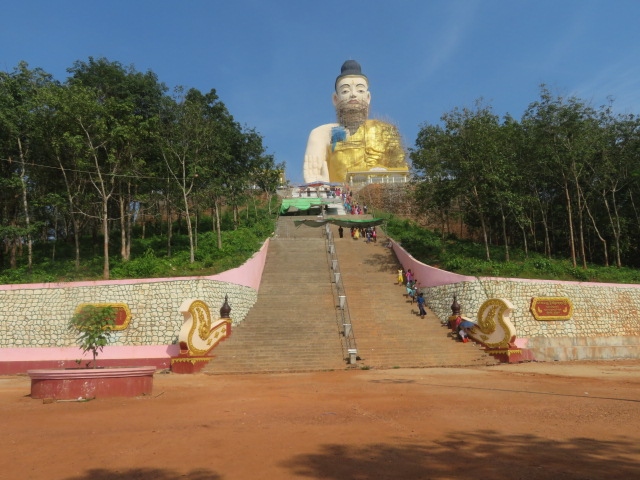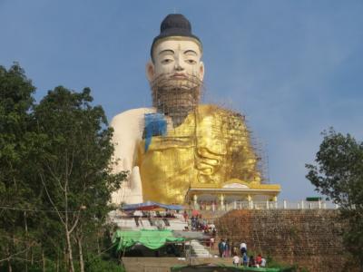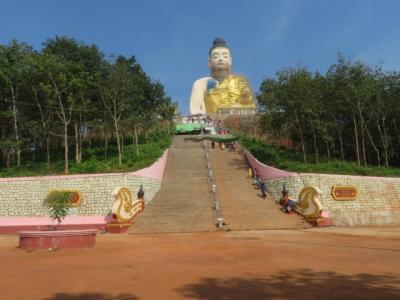 ゴールデンロック(チャイティヨー・パヤ)の観光を終えて麓のキンプンからバゴーに移動中20分位すると巨大な仏像が見えたので寄りました、仏像前には広い駐車場があります、駐車場からは幅が広い階段を裸足で上ると高台にある大きな大仏前に出ます、階段を歩くのが大変な人の為に駐車場から大仏前までシャトルバスがあります、大仏の下にある仏殿には誰でも入ることができます、中に仏像などあります、大仏前の広場からの眺望が素晴らしいので楽しめました、大仏の一部は修復工事中でした。