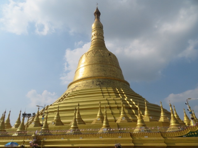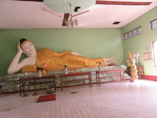バゴー市街の中心にある大きな寺院でバゴーを代表する見所です、中央に高さ114mの黄金の巨大仏塔があります、ヤンゴンにあるシュエダゴンパゴダより高いです、仏塔の歴史は古く1200年前に出来たようで当時は23mだったようでその後何度か改築されて現在の高さになったようです、中央の仏塔の周りを仏殿や仏塔・仏像を見ながら一周しました、仏像は皆、顔や形が違うので見ながら歩きました、境内建物通路では衣料品など販売されていました、安い物もありました。