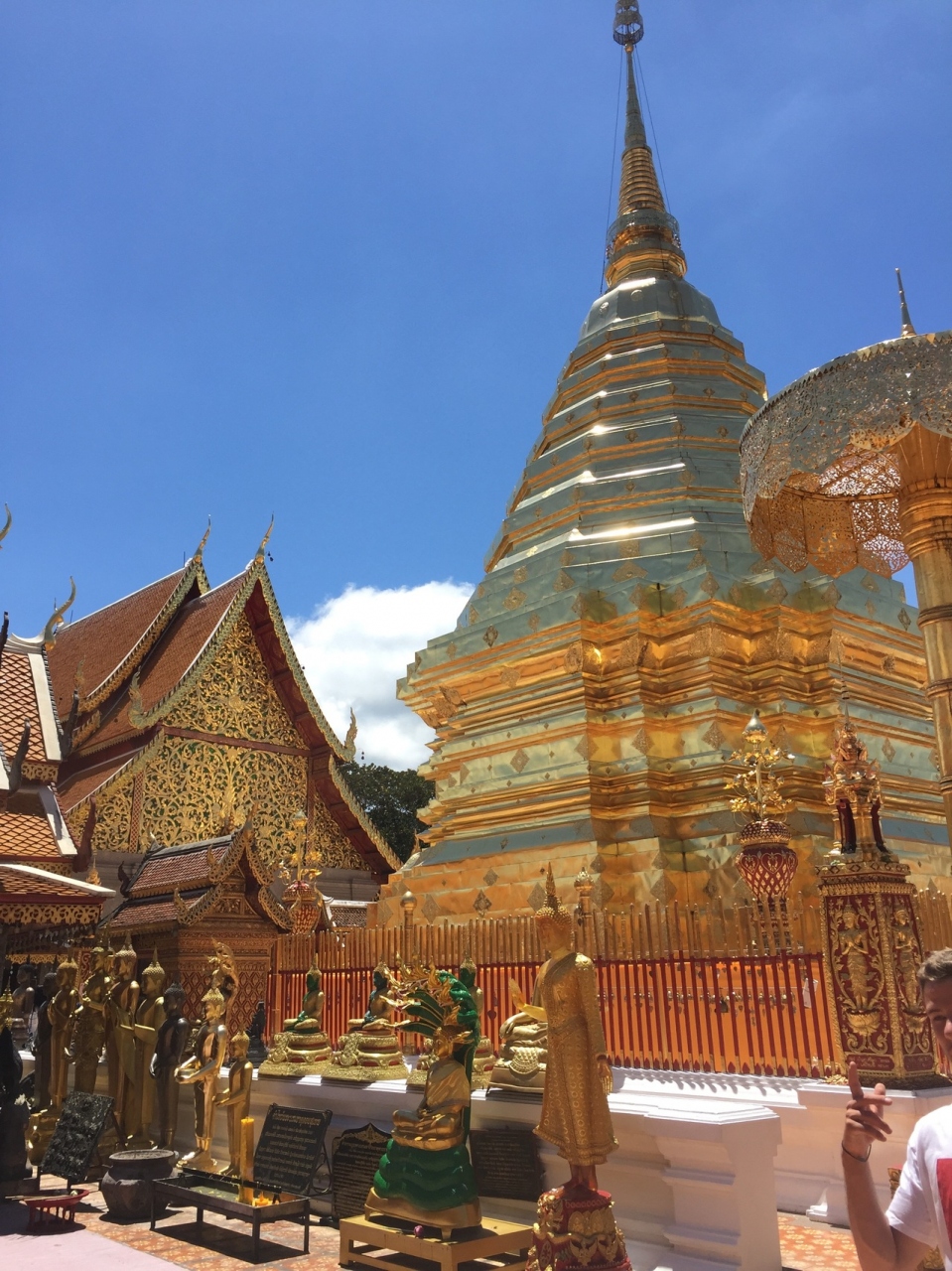 屋台で豚串焼きを購入し、階段を登りました。疲れたと思ったくらいに竜宮城のようなキンキラキンのお寺に到着しました。お寺も金。仏像も全て金色で非常に華やかでした。