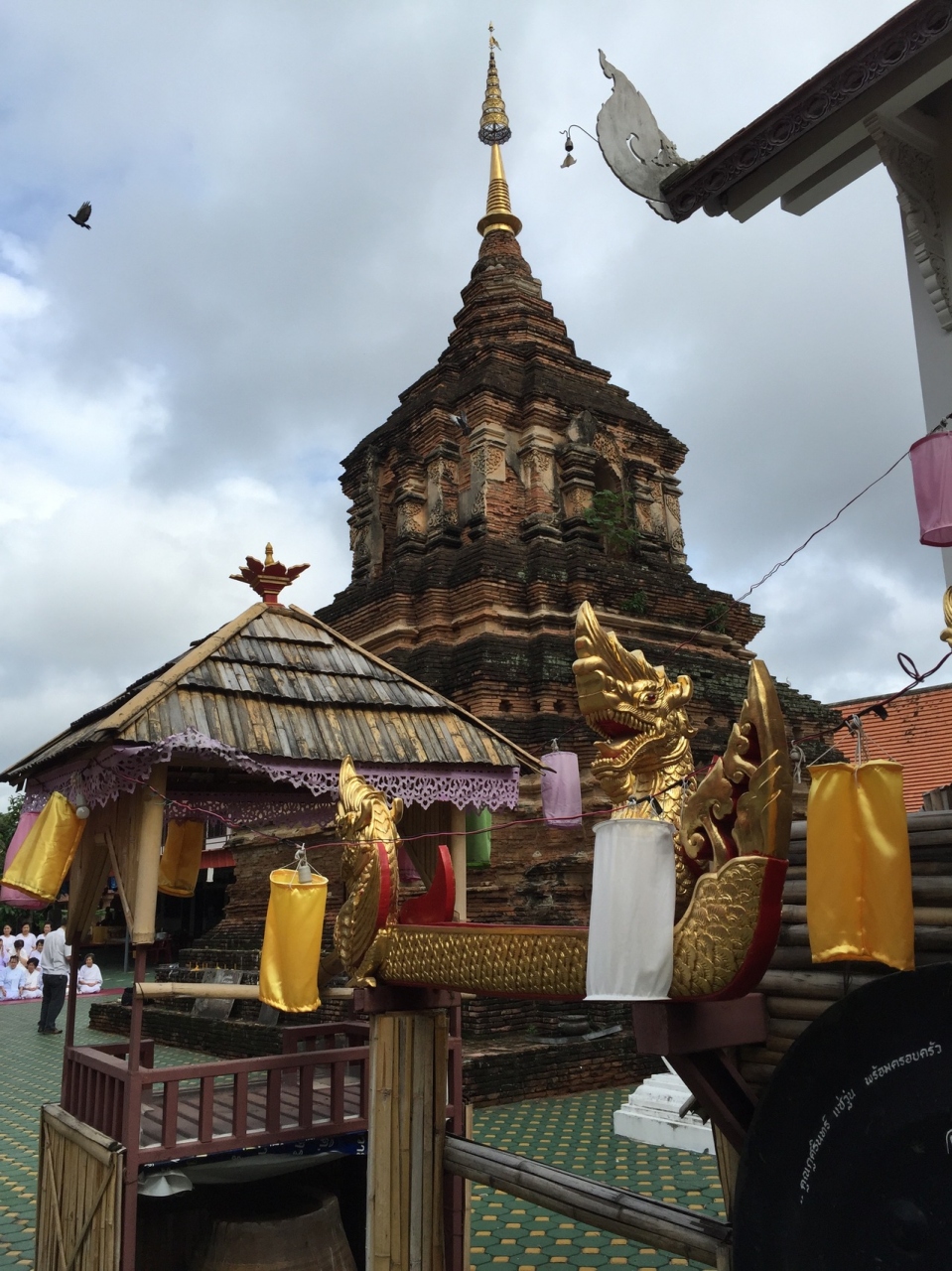 名前をずっとワットチェンマイかと思っていました。がただの勘違いでした。チェンマイでも有名なお寺です。夕方の涼しくなってきた時間に行きましたが、チローンと風鈴がなりながらボケーとお寺を眺めている時間がなんとも言えません。花も咲いておりお寺が映えて映ります。