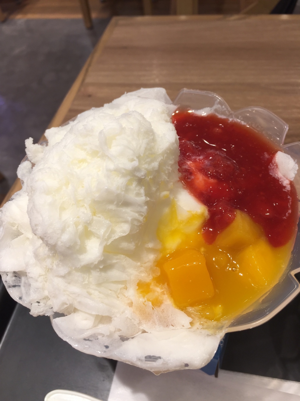 季節限定のかき氷を頂きました。前回は別の店舗でティラミスをいただいたので、今回はイチゴとマンゴーのミックスかき氷を頂きました。氷なのに食感がふわふわしており口の中でとろけます。価格は500円以上しますが、食べてよかったです。