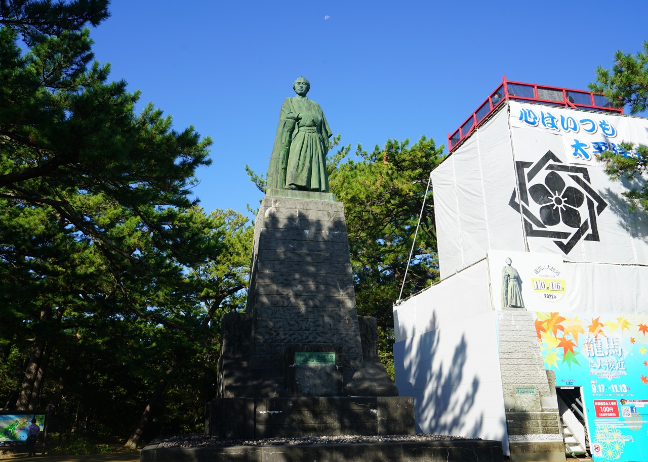 若宮八幡宮にも参拝しました。こちらは長宗我部元親公が初陣の際に戦勝祈願をした神社ですが、参道途中に「長宗我部元親公初陣の像」がありました。合戦に挑む前夜、若宮八幡宮に陣取った姿を表現し、力強く前に伸ばされた左手は、足下に広がる四国の大地をつかみ取ろうとしているのだそうです。高知と言えば龍馬押し一辺倒かと思いましたが、しっかり地元の英雄を押しています。