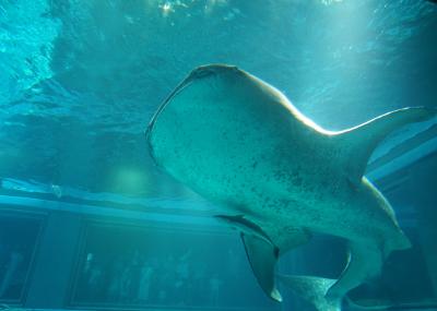 海遊館のコンセプトは、「地球とそこに生きるすべての生き物は、互いに作用しあう、ひとつの生命体である。」という考えに基づいています。3Fから入場すると8Fまでエレベーターであがります。海遊館の展示は、8Fの日本の森から始まり上階から下に降りていきながら見ていきます。やがて海遊館のシンボル、巨大な「ジンベエザメ」の登場します。