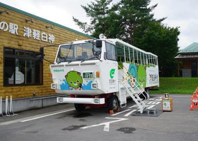 白神山地ビジターセンターの前にある道の駅です。珍しい水陸両用車があったので見ていると、これから(9時半)でるダムツアーに空きがあるとのこと。本来は、前日以前の事前予約が必要のようですが、ラッキーなことに乗ることができました。水陸両用車楽しんだ後は食事やお土産を買ったりしました。こちらには津軽ダムと津軽白神湖を模した「津軽ダムカレー」という大盛りのメニューがあったり。はちみつやシードルなどのお土産も充実していました。
