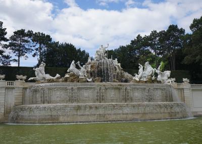 シェーンブルン宮殿のある広大なバロック庭園。シェーンブルン宮殿から見て、手前にネプチューンの泉、奥にグロリエッテが見えたので、ツアーの自由時間(15分)に歩いたのですが近くに見えてけっこう距離があり、時間的にはここまでが限界、残り5分慌てて入口(ツアー集合場所)に戻りました。巨大なネプチューンの噴水、ギリシャ神話の海神ネプチューンに祈りを捧げる女神ティネスなどの彫刻が見られます。