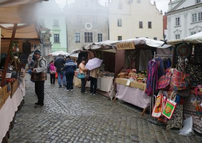 世界遺産の街チェスキークルムロフの中心広場です。それほど広くはないですが、周りをインフォメーションセンターや市庁舎、レストランなどが囲んでいます。民芸品やお菓子など売っている露店が並んでいましたが、私が行ったときは雨が強くすぐにレストランに入ってしまいました。