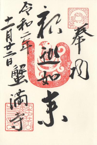 木津川市にある蟹満寺。お寺の周りは実にのどかで、参拝客は私たちだけと、とても静かなお寺でした。蟹満寺は、かつては「紙幡寺」「加波多寺」とも言われており、白凰期の末期(690年代)に、秦氏によって建立されたと伝えられている古刹です。創建について詳しい資料もなく、現在は新しい本堂が建つのみですが、1990年の発掘調査では、7世紀末の大規模な寺院建築の遺構が発掘されました。創建当時の本堂は、現在の奈良・薬師寺の金堂に匹敵するほどの規模であったことが判明しています。2010年に建て替えられた本堂には、白鳳時代の丈六サイズの金銅仏「釈迦如来坐像」がいらっしゃいました。とにかくこの国宝の「釈迦如来坐像」が素晴らしい。像高2.4メートル、重さ2.2トンの金銅製の巨大仏で、この時代の丈六サイズの金銅仏は、飛鳥寺の飛鳥大仏、興福寺の仏頭、薬師寺の薬師如来坐像などが残るのみで貴重なもの。何故、この地にこんな仏像があるのか不思議ですが、創建以来ずっと不動でそれほど修復もないようです。これだけを見に来ても十分価値があります。