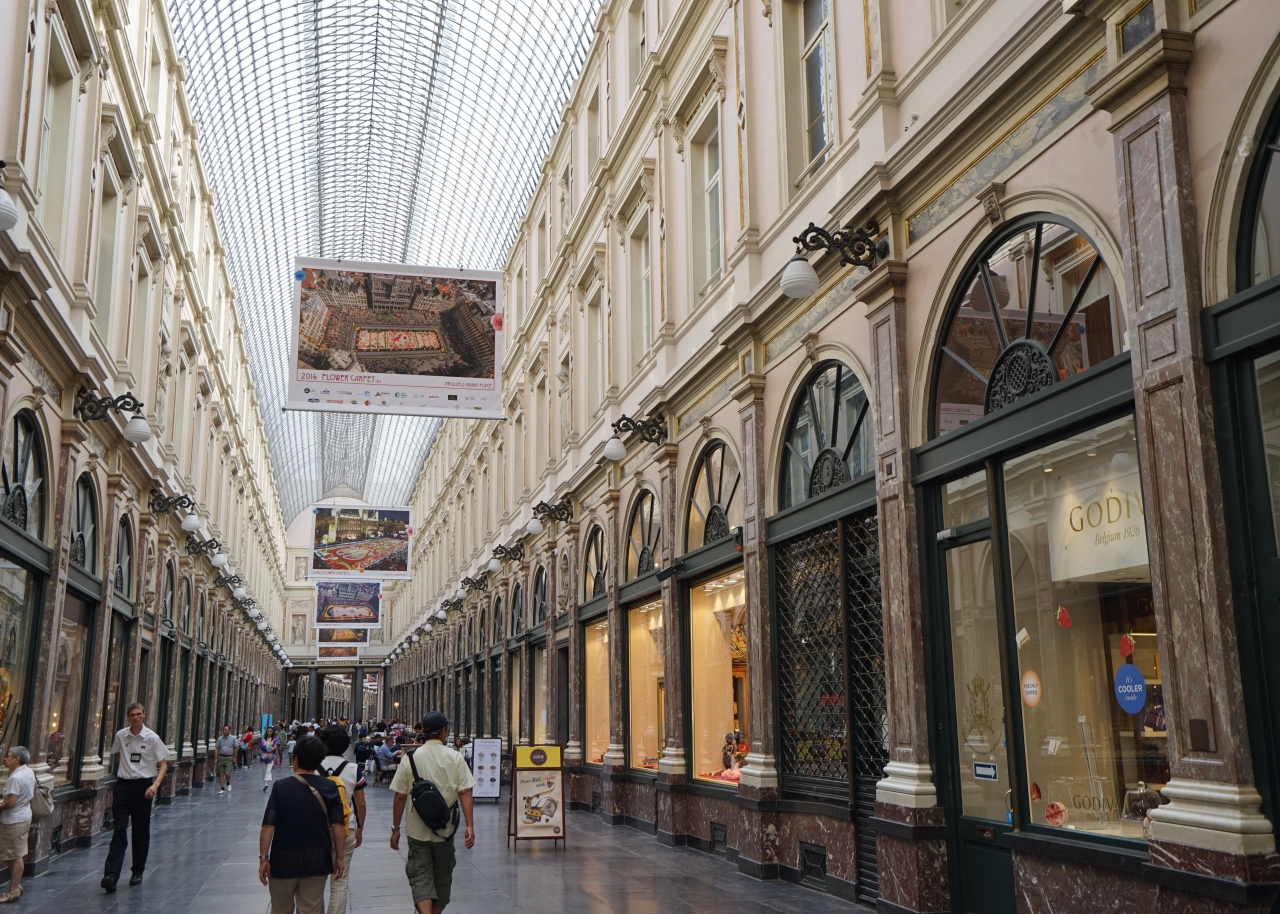 グランプラスから徒歩数分のところにある1847年に建造されたヨーロッパ最古のショッピングモール。訪れたのは朝だったのでまだ開いていない店も多かったのですが、ガラスの天井に覆われた美しい装飾に囲まれたアーケードは雰囲気良かったです。