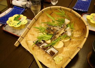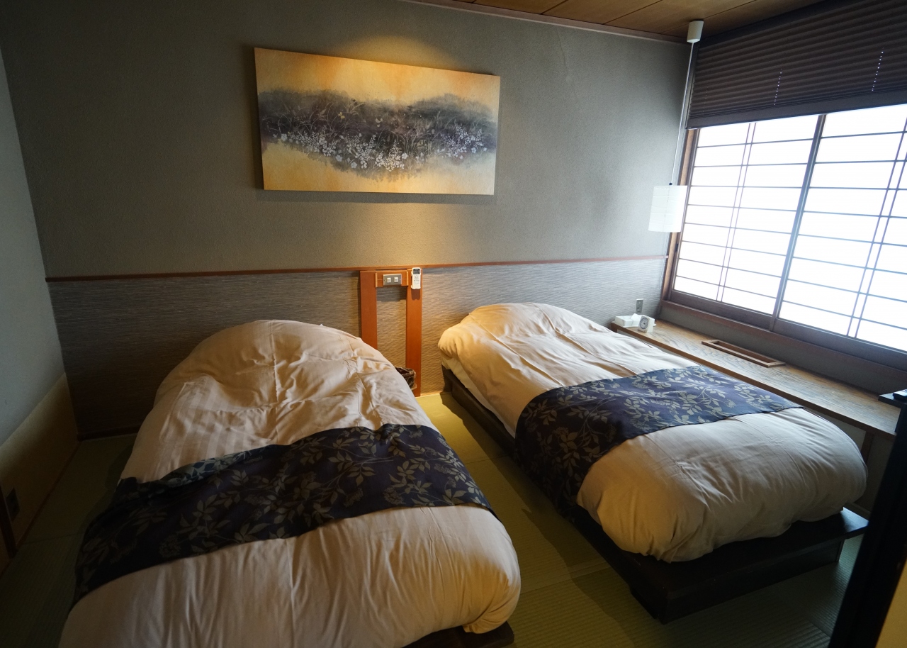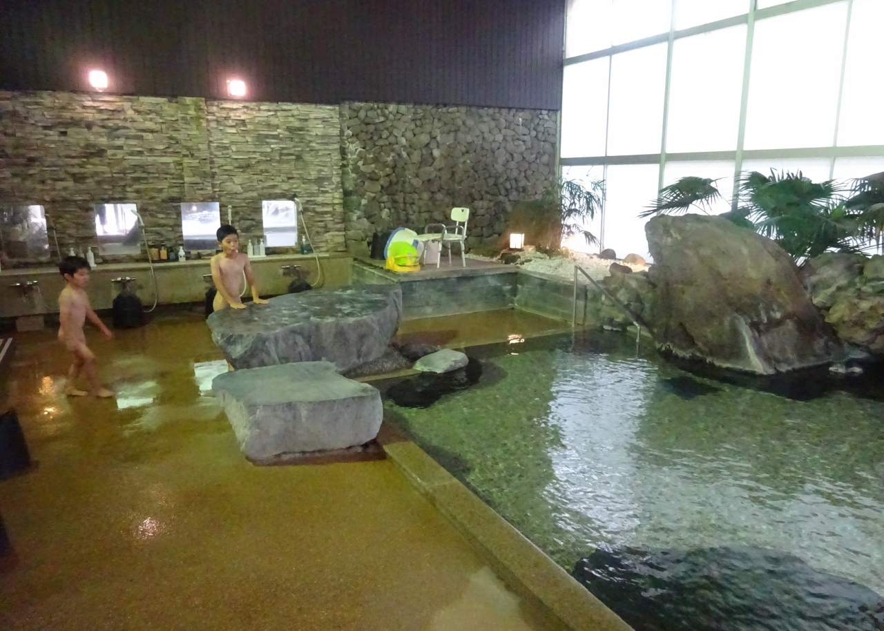 こちらの宿「くつろぎの邸 くにたち」は、中央に涼しげな庭がある和風のお宿。庭には大きな池があり、たくさんの鯉が泳いでいました。部屋は、10畳+6畳の和室2間。建物は少し古さを感じますが、季節を感じる中庭を眺めながら、ゆっくりくつろげる和洋室です。こちらの宿の風呂は、大浴場の「月の湯」、露天風呂付大浴場「夢ざくら」と3つの貸切風呂があり、加えて十五種類の薬石を床一面に敷き詰め、そこに温水を通し、温水だけで薬石に熱を加えミネラルを発生させた薬石浴「嵐の湯」がありました。大量の汗と老廃物を排出させて体の中から癒されます。「お肌がツルツルになった」と一緒に行った妹は言っていました。こちらの「嵐の湯」へも2回ほど行きました。食事も満足いくものでした。