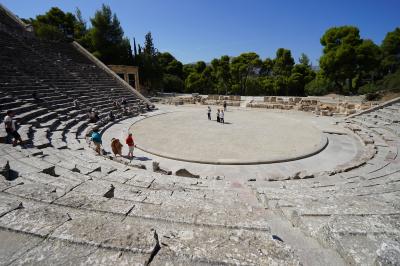 世界遺産エピダウロス遺跡にある古代劇場ですが、ギリシャで最も保存状態の良い古代劇場として知られており、とても紀元前4世紀中頃に建造されたものがそのまま残っているものとは思えません。55段の観客席、1万4000人を収容する事ができ、現在でも劇が上演されるそうです。最上段まで上がるのはかなりシンドイ・・・こちらは、山の中にあるため、最上階にあがっても景色はそれほどのものではありませんでした。階段(石段)で転んでいる方もいらっしゃいましたので足元にはご注意を。