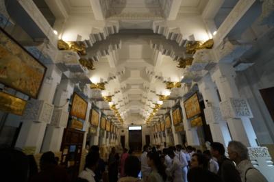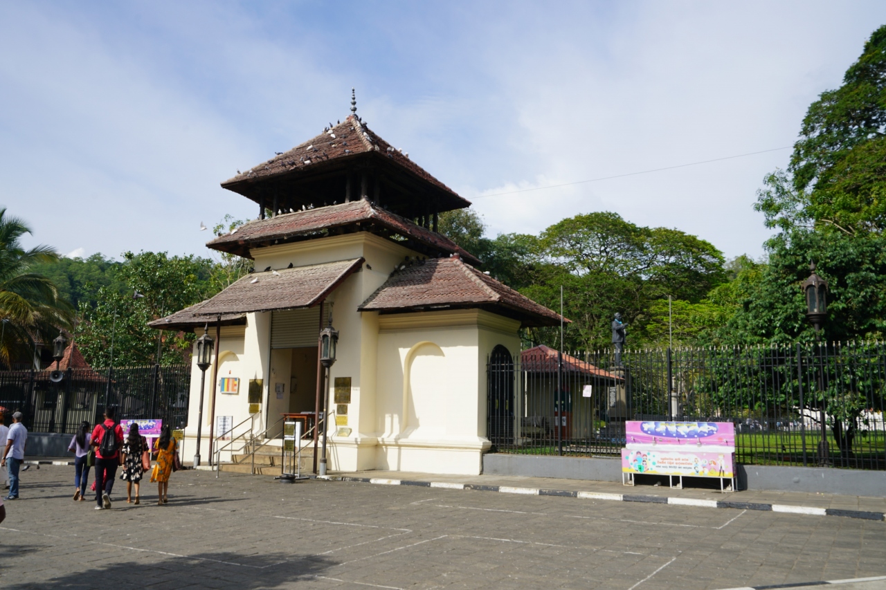 キャンディ湖のほとりに建つ、スリランカを代表する仏教寺院「仏歯寺」。敷地内には、仏陀の歯が祀られている本堂があります。仏歯は4世紀にスリランカへもたらされたといわれており、当時の王都アヌラーダプラの礼拝堂に祀られていました。その後、12世紀に王都がポロンナルワに移り、それとあわせて仏歯も移されます。この頃には、仏歯の神秘的な力によって恵みの雨がもたらされ発展する、という信仰と、仏歯を持つ者がシンハラ王国の王位継承者であるという考えが広まります。そのため仏歯は王都が動くたびに移動し、1590年、最後にキャンディの仏歯寺へとわたっていきました。本堂では1日に3度、礼拝が行われます。ちょうど礼拝が行われているところでした。