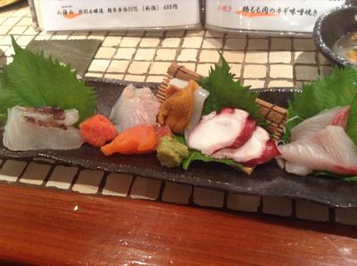 おでん、刺し盛りを注文。おでんは、玉子、大根、蒟蒻、厚揚げ。刺し盛りは鯛、ヒラメ、カンパチ、蛸、雲丹、いか、明太の内容。刺し盛りは福岡の高いレベルの中では普通な感じ。メニューを見ていると、海鮮よりは肉系が得意な感じでした。