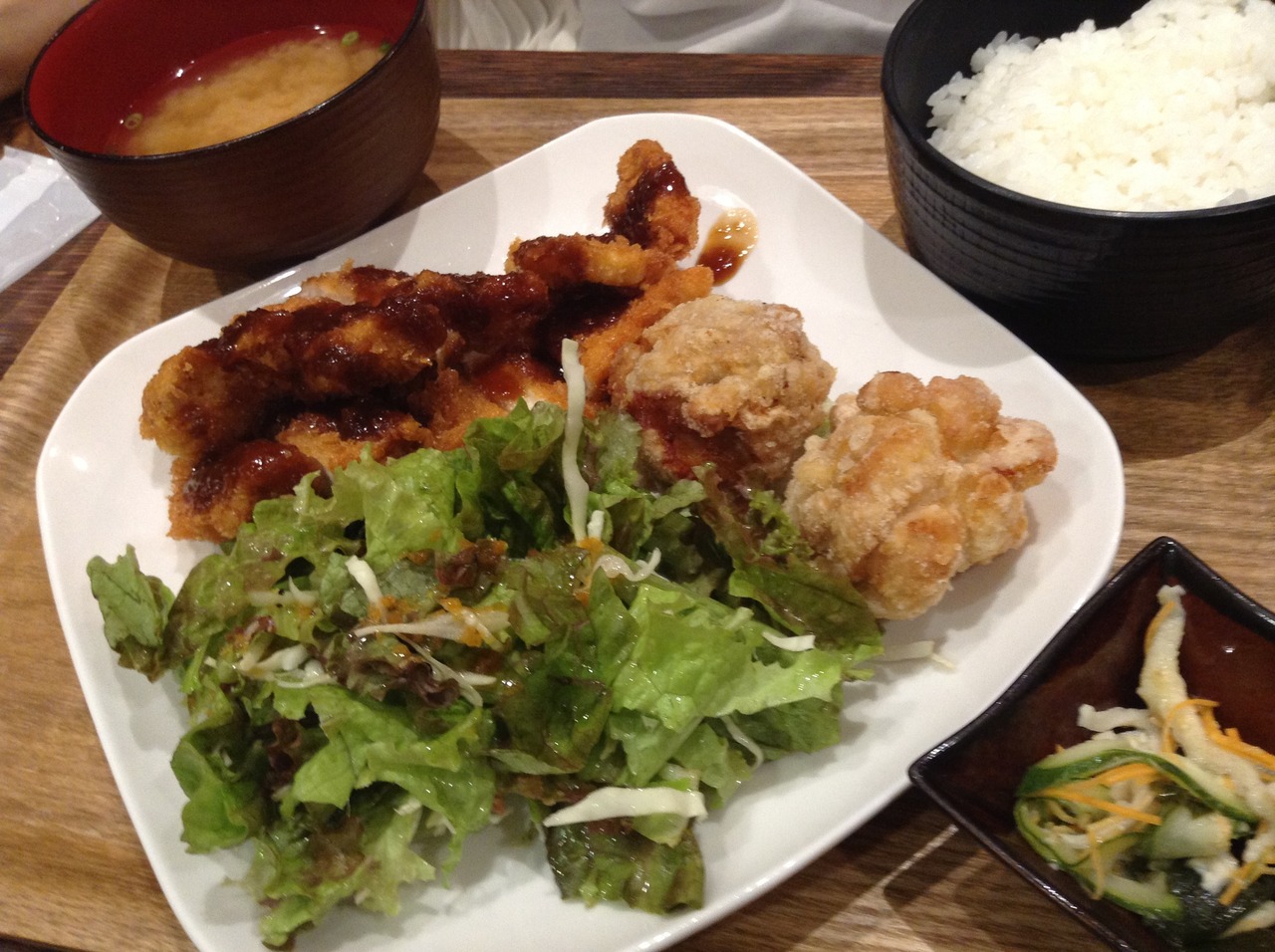 華味鶏の唐揚げとチキンカツ、もも焼き定食を注文。御飯と味噌汁はお代わりができます。
