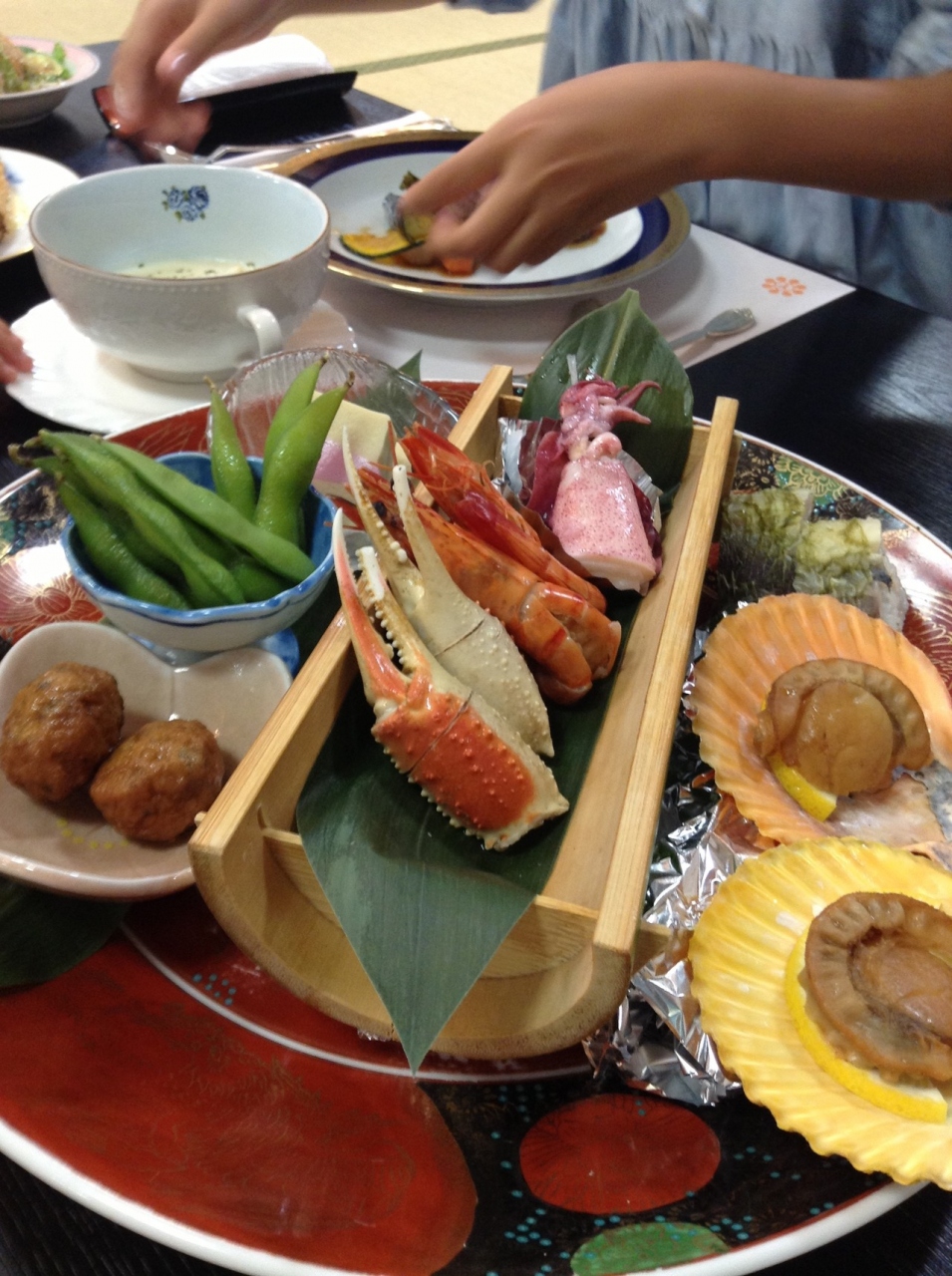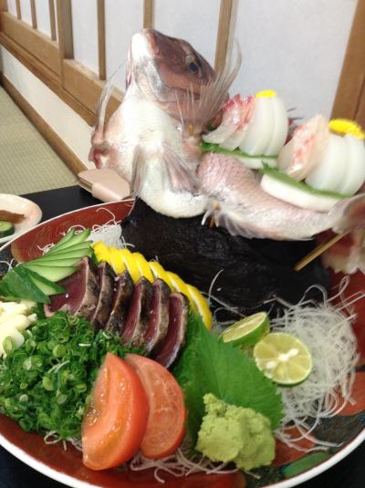 夕食に皿鉢料理がでましたが、イマイチでした。刺身は鰹タタキ、イカ、鯛、マグロで美味しかったです。牛ステーキ、伊勢エビなども盛り沢山ですが、全体的に印象が薄い、大味なかんじでした。