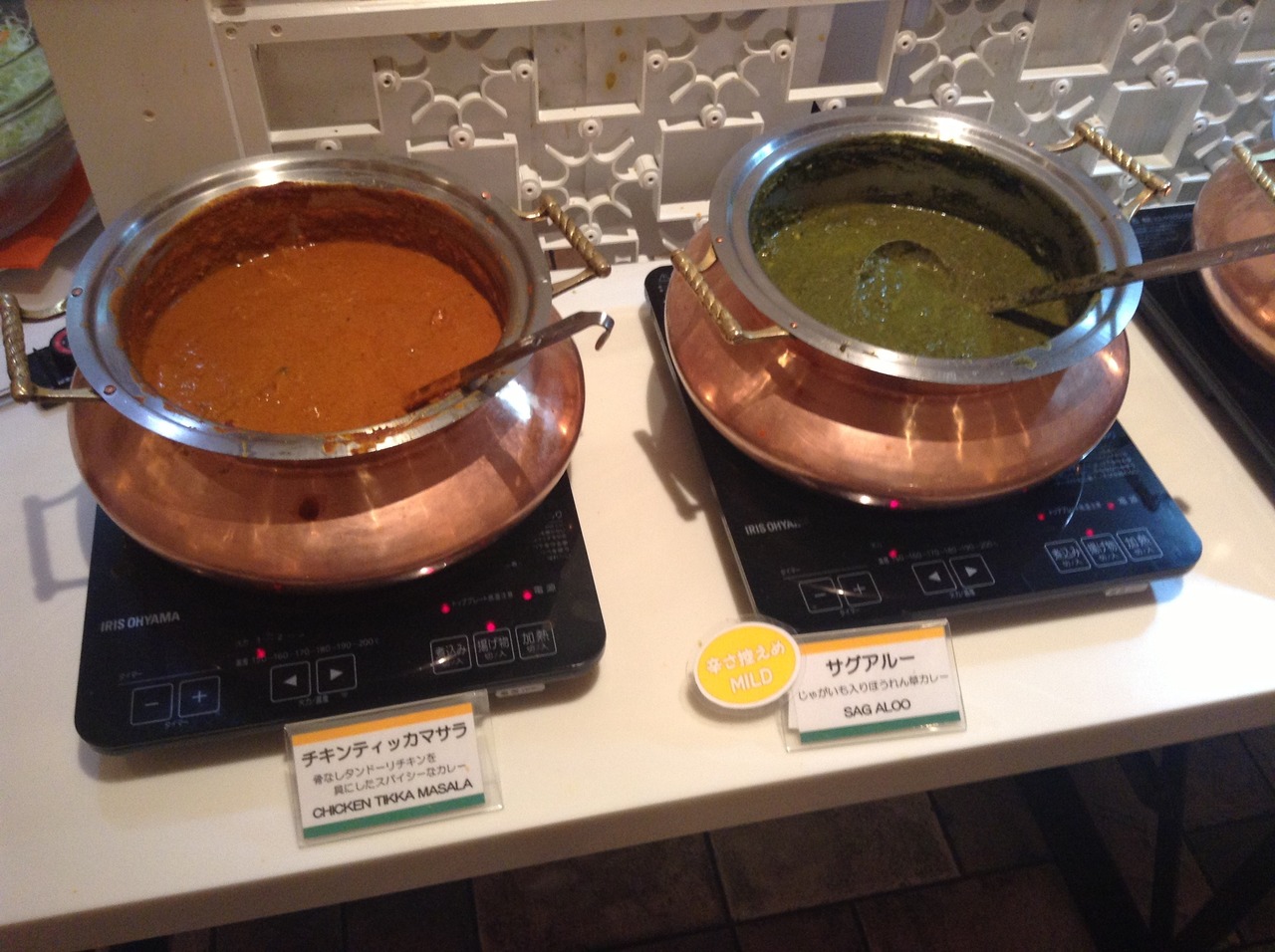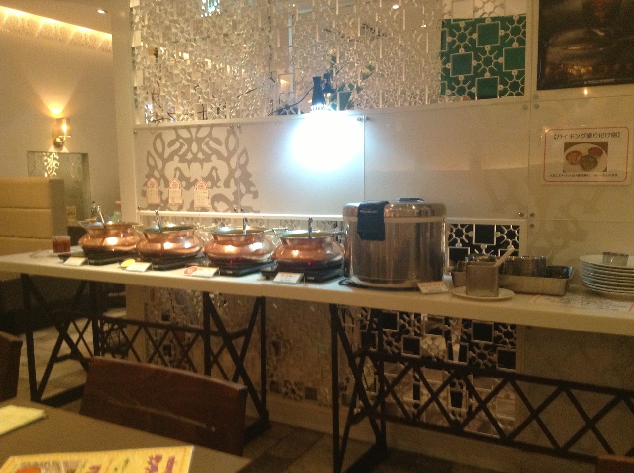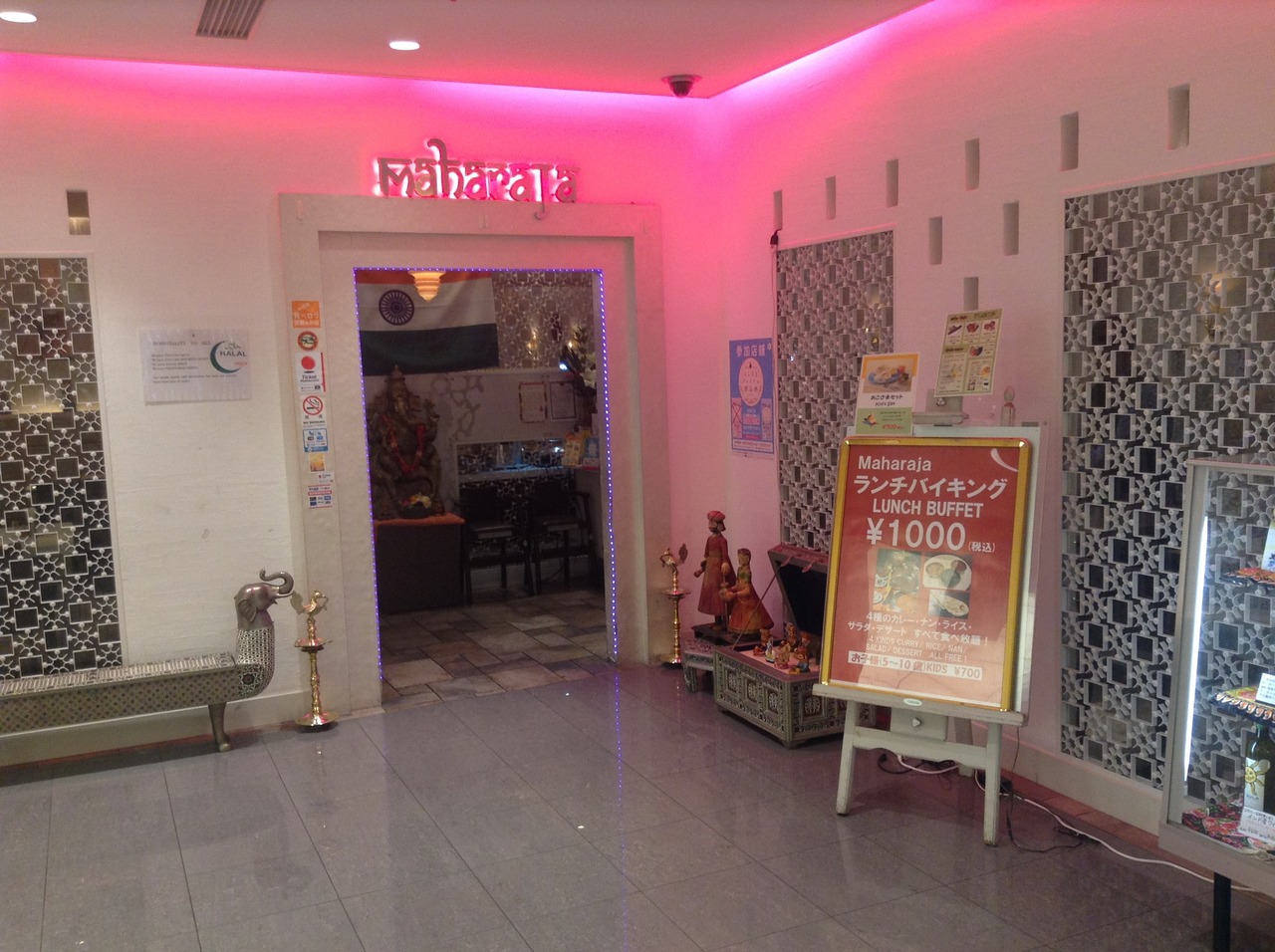 マハラジャは、新横浜の駅ビルキュービックプラザの飲食店街にあるインド料理店です。ランチはブュッフェで、チキン、ダル、野菜、ほうれん草のカレー、ナン、ごはん、サラダが食べ放題。ドリンクもマンゴラッシーが100円でした。