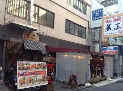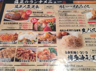 益正は、福岡で多店舗展開する居酒屋です。今回は天神本店にてランチで利用。博多黒田膳を注文。730円。豆腐ハンバーグ、おからコロッケ、つみれ揚げ出し豆腐がついてきてボリュームがあります。ポン酢ベースのソースが味が濃ゆいせいか味が単調に感じられます。ランチメニュー豊富なので、他も試してみたいです。