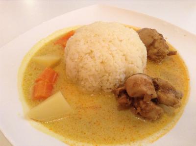 野菜カレーとチキンカレーがかかっていて2種類の味が楽しめます。カレーのルーが一回お代わりできるという嬉しいシステムです。