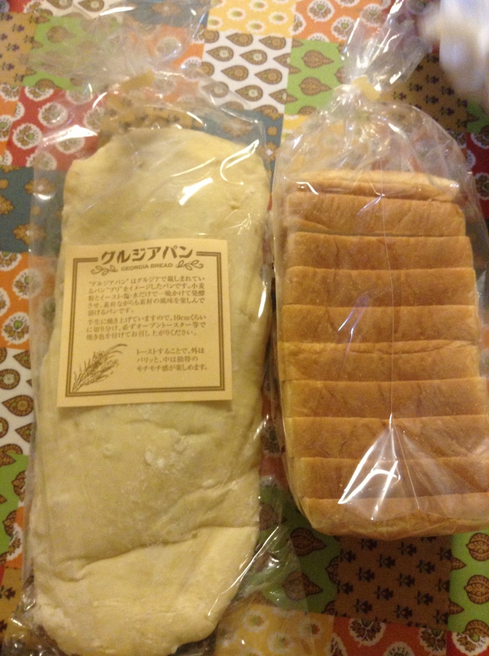 ベーカリーを利用。グルジアパンという珍しいパンを購入。小麦とイースト、塩、水だけで作ったパンとのことで、もちっとして美味しかったです。