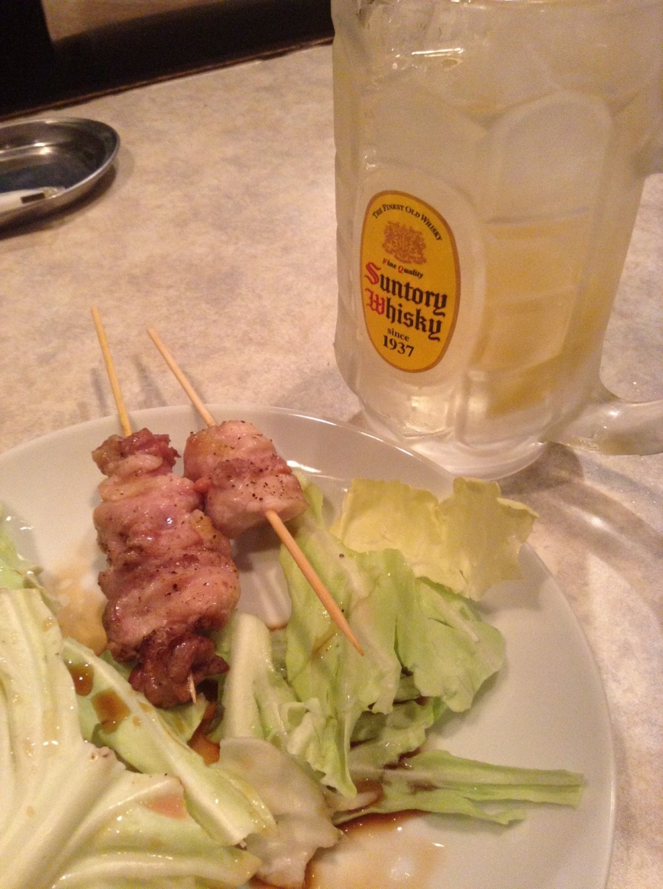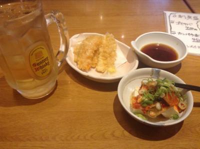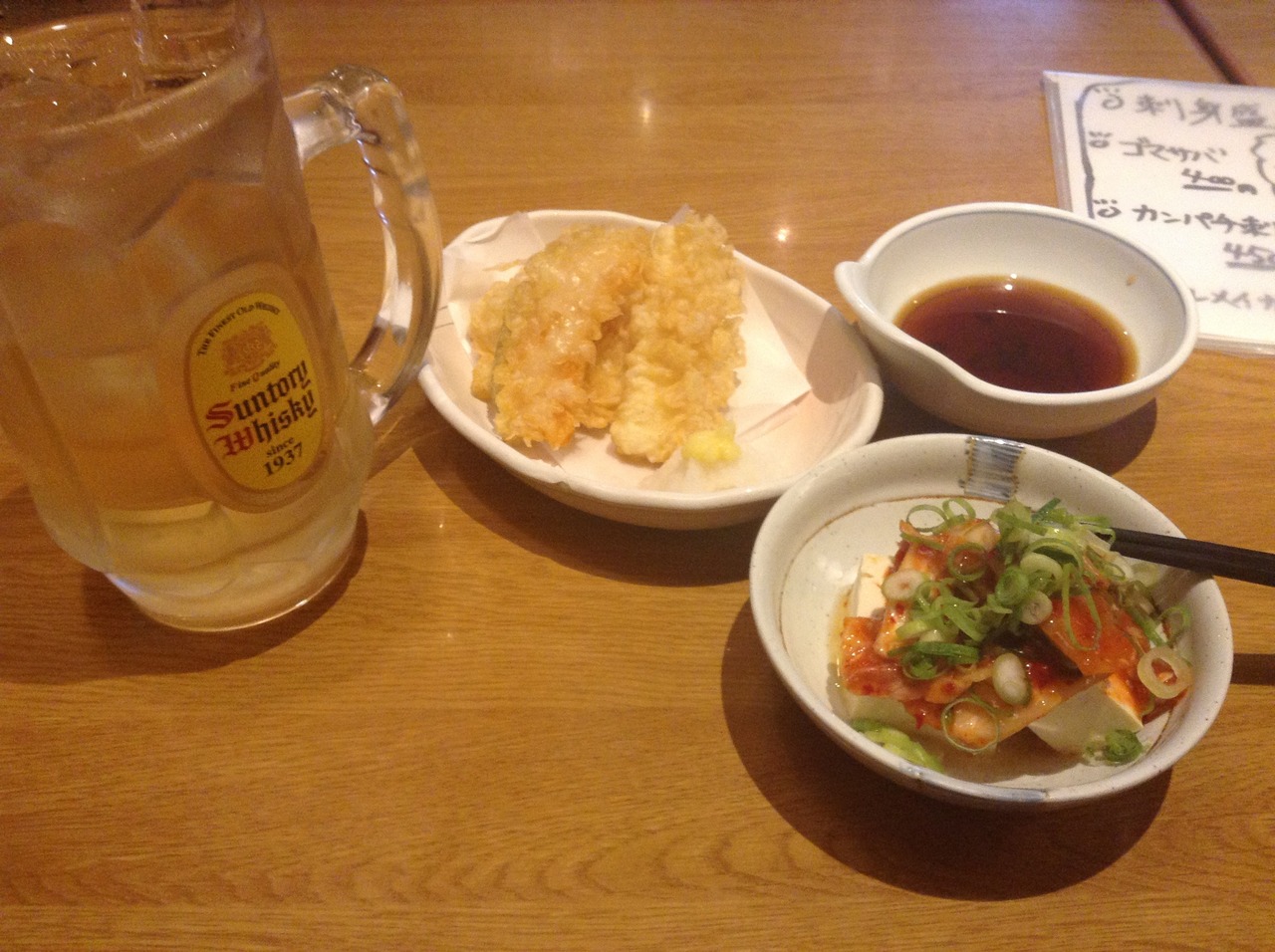 磯辺揚げ、いかの天ぷら、キムチやっこにハイボール二杯注文。