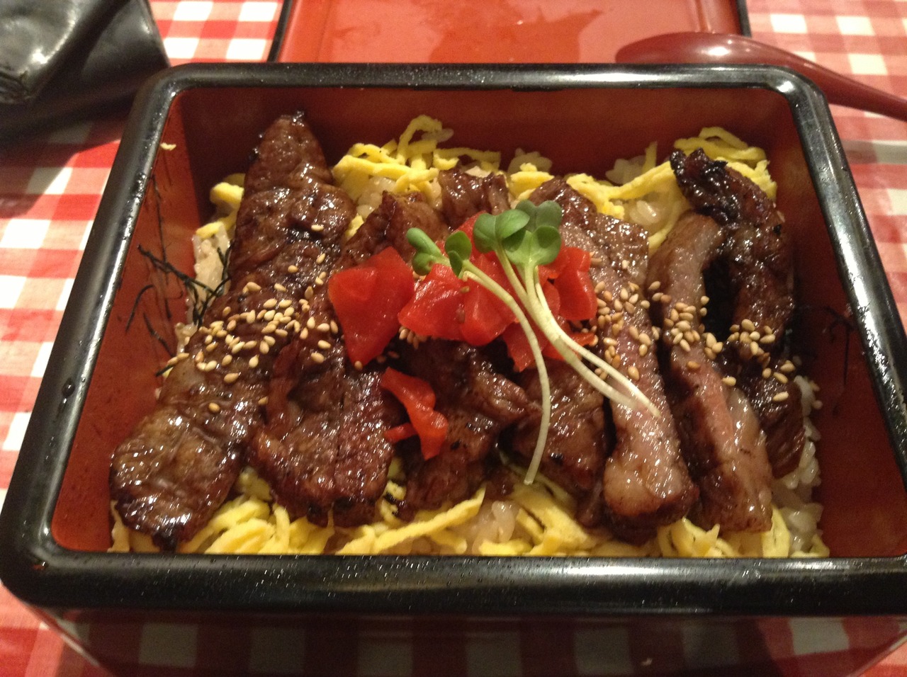 ランチで、中落ち牛カルビ重1280円を注文。税込で1380円になるので、場所がらか少し割高な感じもしますが、ただ、カルビは柔らかく、甘みもあって、するする完食してしまいます。贅沢なランチでした。- 旅行時期