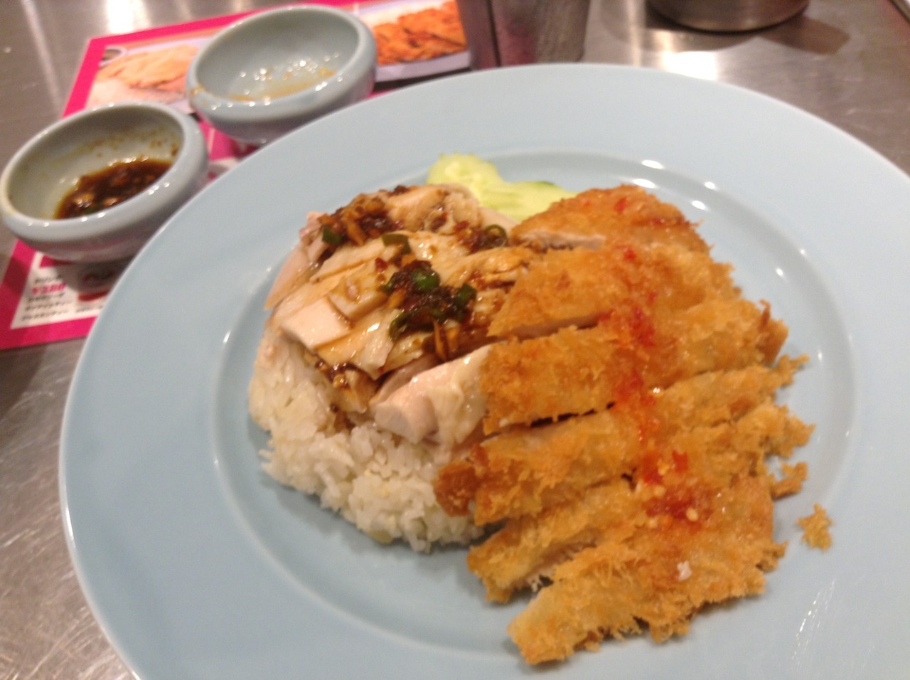 ガイトーン福岡は、チキンカツと、茹で鶏がインディカ米にのったワンプレートランチ900円を注文。チキンカツにスイートチリソース、茹で鶏には、ナンプラーベースソースをかけます。