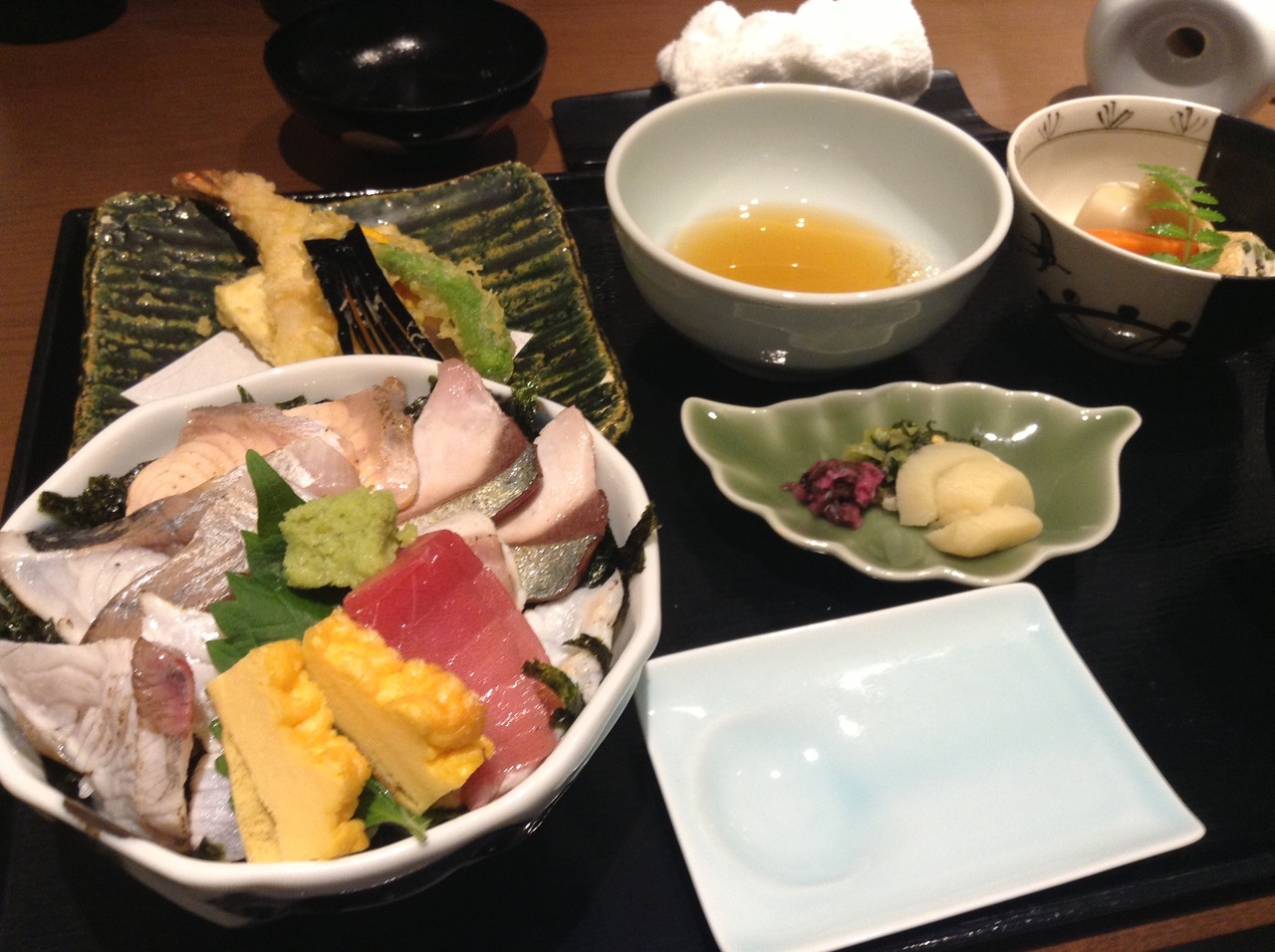 鰤、鯖、鯛の炙りに、玉子、マグロがのった海鮮丼に、海老、茄子などの天婦羅、里芋、南瓜の煮物が付いてきます。