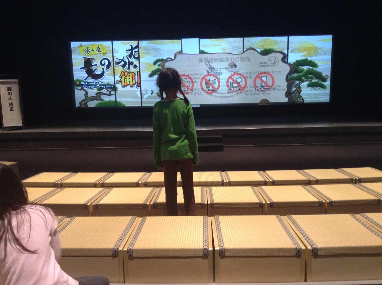 湧々座は、熊本城のふもと、城彩苑にある体験型の観光施設です。一階では、姫様の着物を来たり、駕籠にのったり、子供も楽しめます。パネル、映像は大人向けのものもあり、熊本城のことが良くわかります。