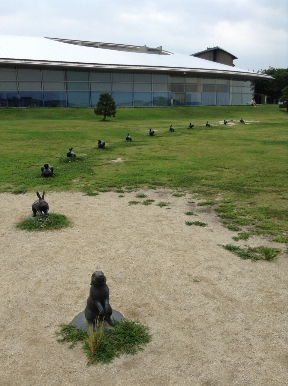 屋外に彫刻作品かあり、その中でも因幡の白うさぎのサメ渡りをイメージしたと思われる宍道湖うさぎが面白いです。理由はわかりませんが、二番目のうさぎを触ると幸せになると言われています。