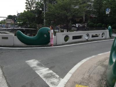 勾玉橋は、玉造温泉にある玉湯川にかかる勾玉があしらわれたデザイン橋です。欄干に巨大な緑色の勾玉がついていて目を引きます。