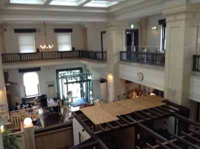 地下に銀行の分厚い扉の金庫跡があり、建物自体の見物も興味深いです。