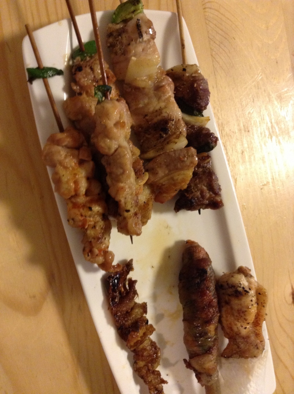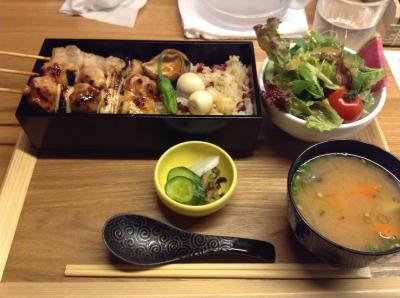 豚バラ、ねぎま、しいたけ、うずら串、サラダ、具沢山味噌汁、デザートの内容でした。