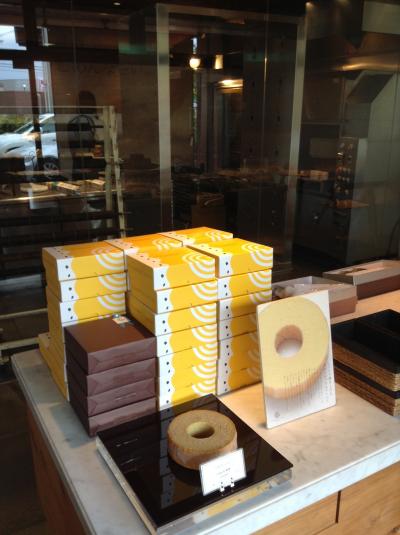 入口を入ると正面にバウムクーヘンが積んであり、つい買いたくなります。ショーケースのケーキはどれも美味しそうです。